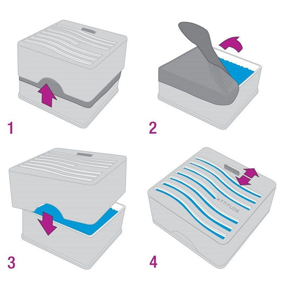 - Verwijder het deksel van de container. Verwijder het versheidszegel. Plaats het deksel terug op de container en pas het gewenste absorptieniveau en de geurintensiteit aan.